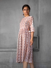 Gathered at the waist, Ikat patterned flowy dress in easy cotton. Mid-calf length, round neck, 3Q sleeves. Pretty 'doris' on the sides with fabric tassels. It's the perfect prêt-à-porter for a casual lunch.