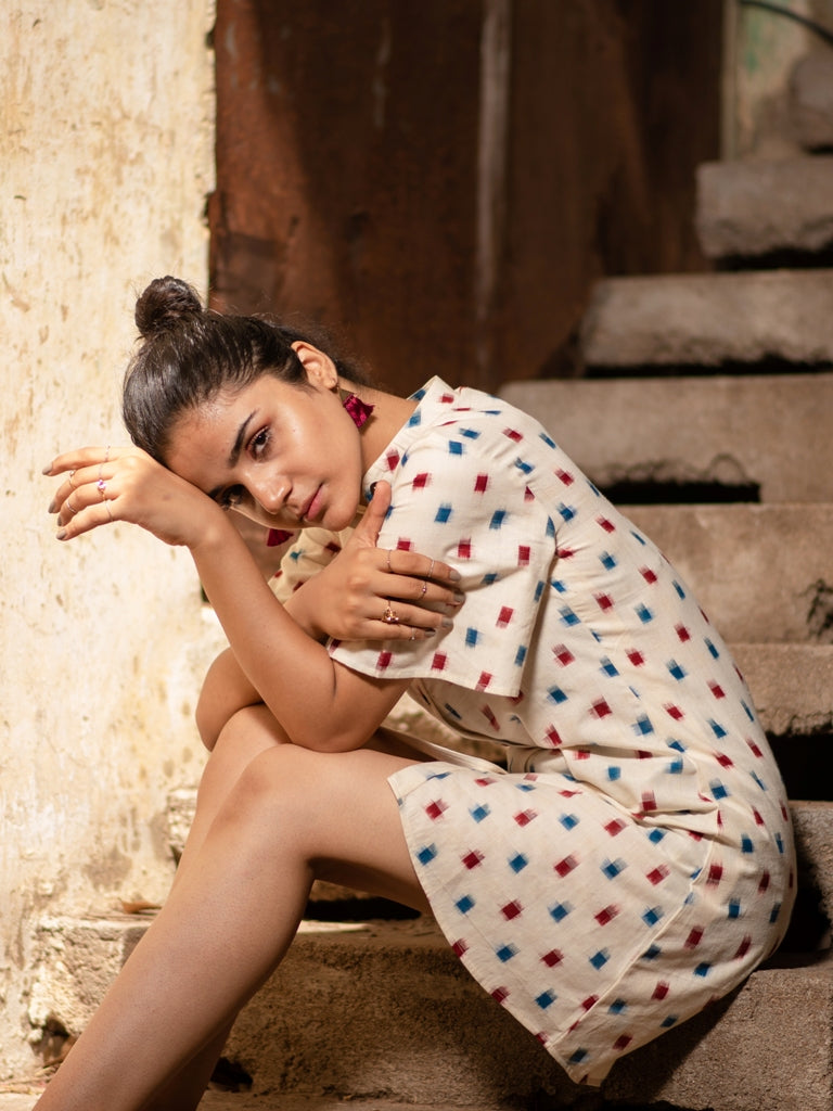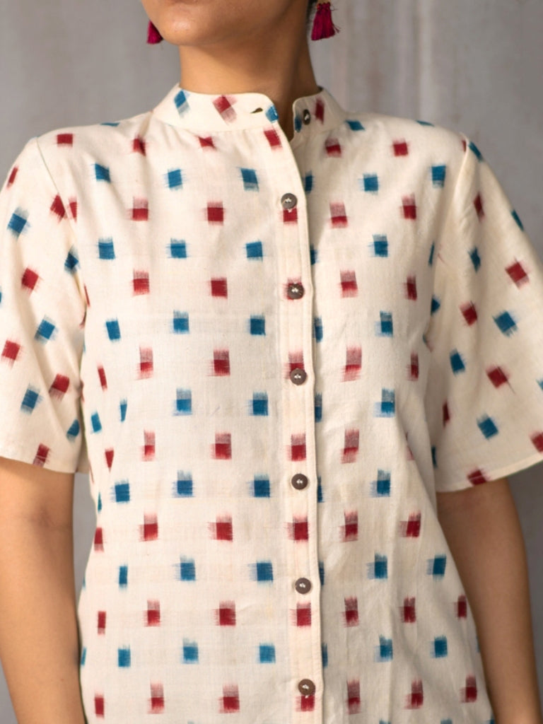 Look chic in this Ikat checkered shirt dress. 3Q sleeves, mandarin collar, coconut shell buttons, breezy cotton fabric. Pair it with pants or wear it as a dress. Either way, you will look dapper in this piece.