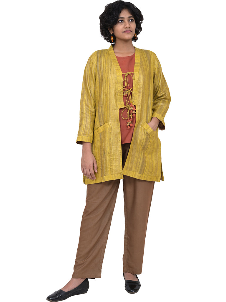 Handwoven in brilliant Lime Green Raw Silk over jacket lined with Hand Block Printed fine handloom cotton. Ideal to wear over a sari or with straight pants in any season.